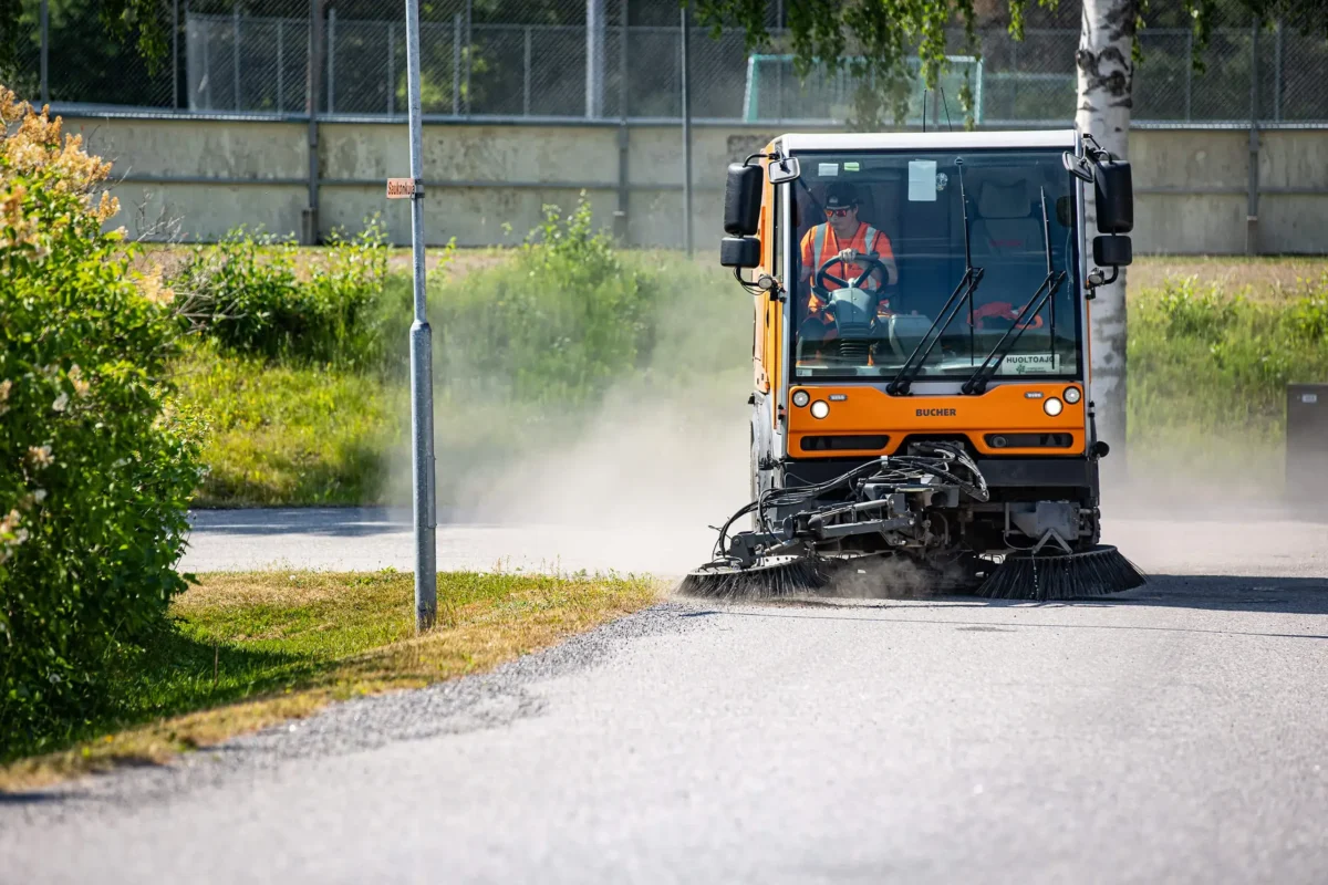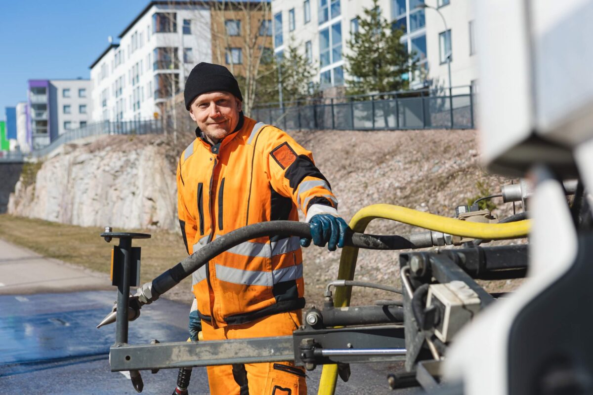 ”Kunnossapitotyössä palkitsee se, että oman työn jäljen näkee heti. Keväisin katujen pesu ja hiekan poisto ovat hetkiä, jolloin saa eniten kiitosta – asukkailta tulee usein suoraa palautetta”, Lennu kertoo.